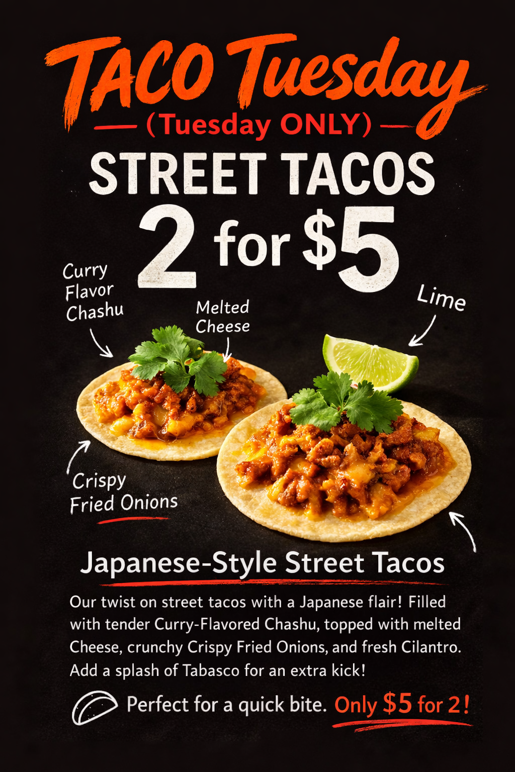 Don’t miss Taco Tuesday, available every Tuesday only. 🌮🍜